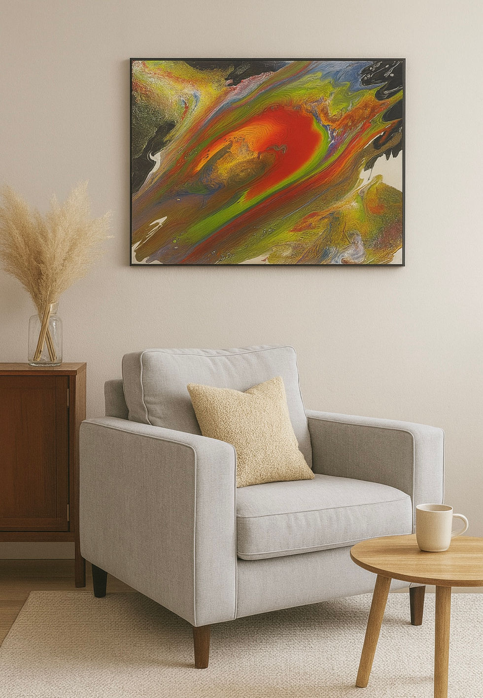 Experience the vibrant energy of fluid acrylic art in modern living spaces. From cozy armchairs to contemporary sofas, our art brings a unique touch to any room.
